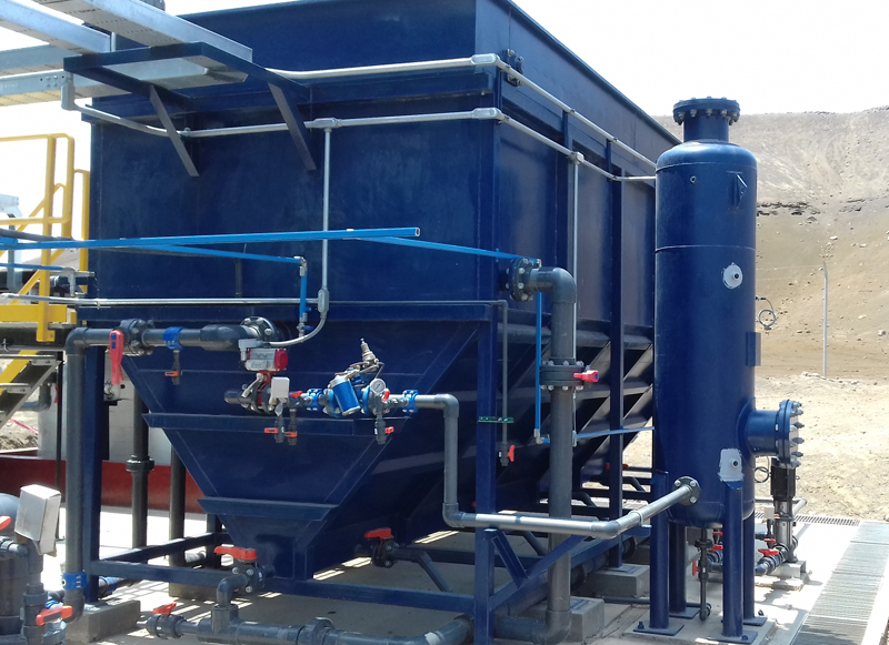 Nuestras celdas de flotación por aire disuelto son equipos de alta eficiencia para remoción de grasas emulsionadas y sólidos suspendidos. Debido a la disolución de aire en agua a alta presión y la posterior expansión de este, se logra la formación de una microburbuja de un tamaño menor al logrado por otras tecnologías como cavitación o aire difuso lo que permite que el área de flotación requerida sea menor.